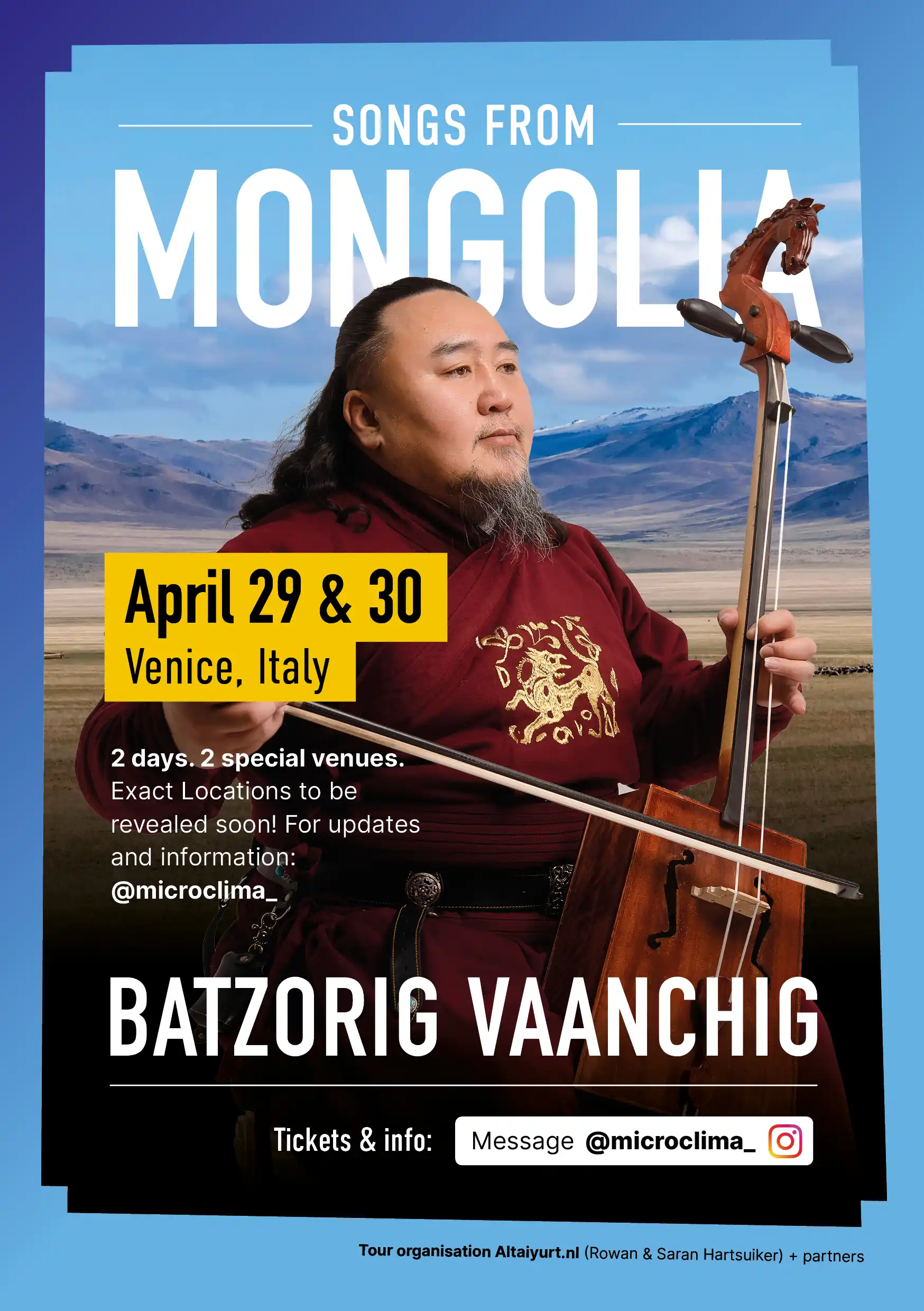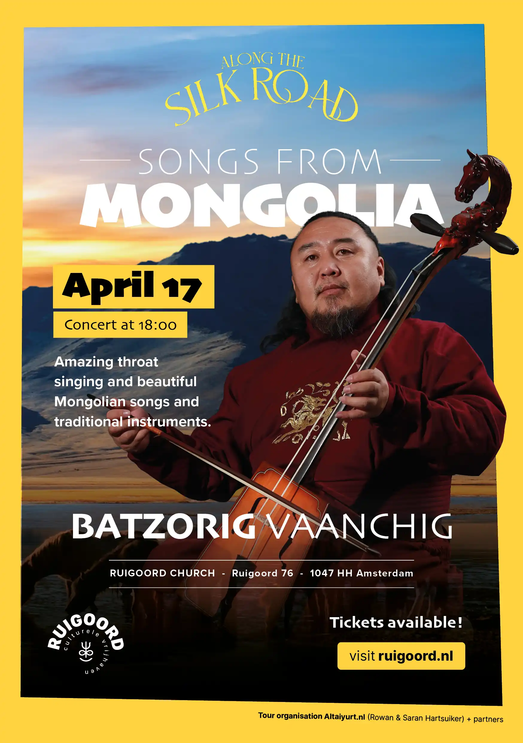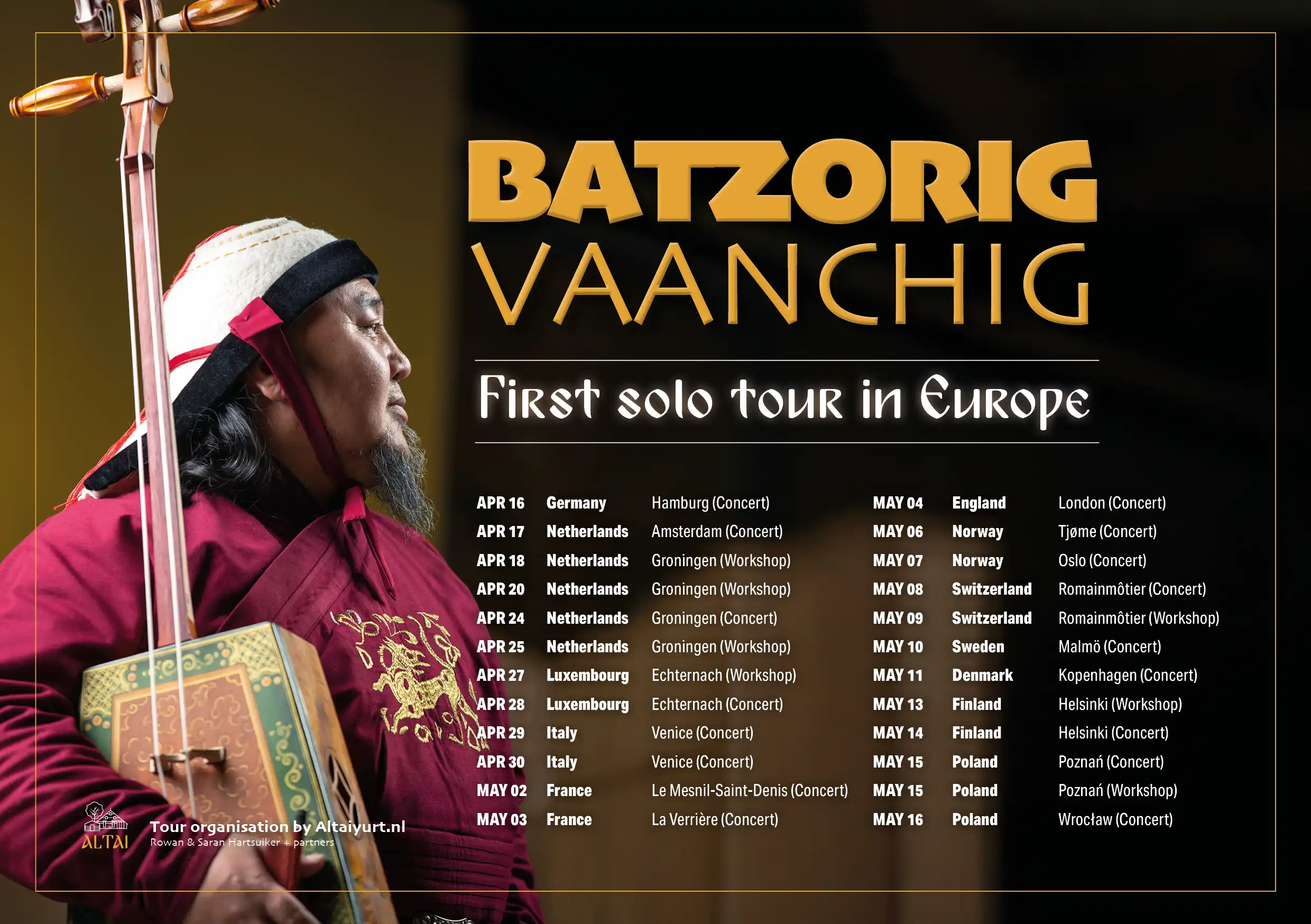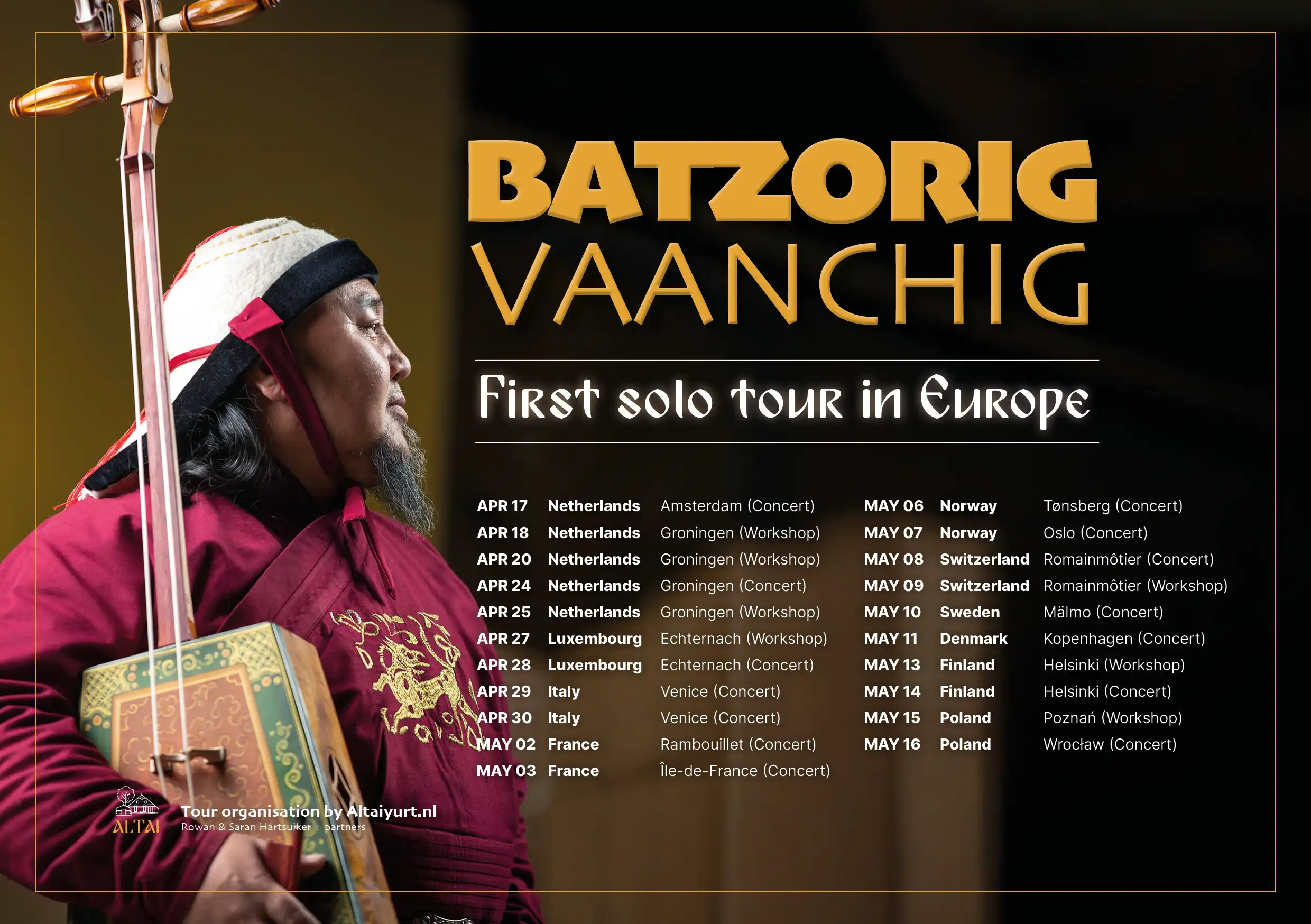 This European solo tour is organized by Altai (The Netherlands), a cultural initiative founded by Rowan Hartsuiker and Saran Myagmarsuren. Altai is dedicated to sharing Mongolian music and culture in Europe through concerts, workshops, retreats, and long-term cultural collaborations.